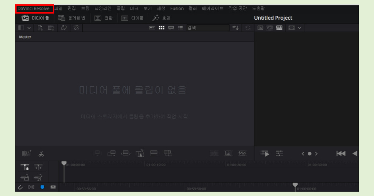 프로그램이 시작되면 화면 좌측 상단의 'DaVinci Resolve' 메뉴를 클릭한 후 'Preferences...' 메뉴를 선택합니다. 설정 메뉴에서 'User' 탭을 선택하고, 'Language' 설정에서 '한국어'를 선택합니다. 이후 하단의 'Save' 버튼을 클릭하여 설정을 저장합니다. 프로그램을 종료한 후 다시 실행하면 한글 설정이 적용된 것을 확인할 수 있습니다.