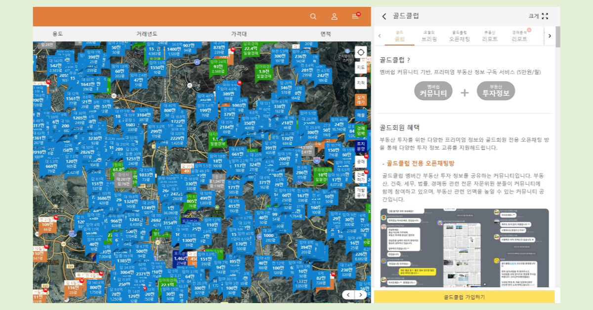 땅야 골드 클럽은 월 5만 원의 구독료를 지불하면 이용할 수 있는 프리미엄 부동산 정보 서비스입니다. 회원이 되면 전용 오픈채팅에 초대되어 부동산 투자 정보 교류, 세무, 건축, 법률 등 다양한 분야에서 무료로 상담을 받을 수 있습니다. 또한 매일 아침 부동산 호재 뉴스를 브리핑 받을 수 있는 등 다양한 혜택이 있습니다. 땅야 골드 클럽은 프리미엄 정보를 제공하며, 많은 부동산 투자자들이 이를 이용하여 큰 도움을 받고 있습니다.