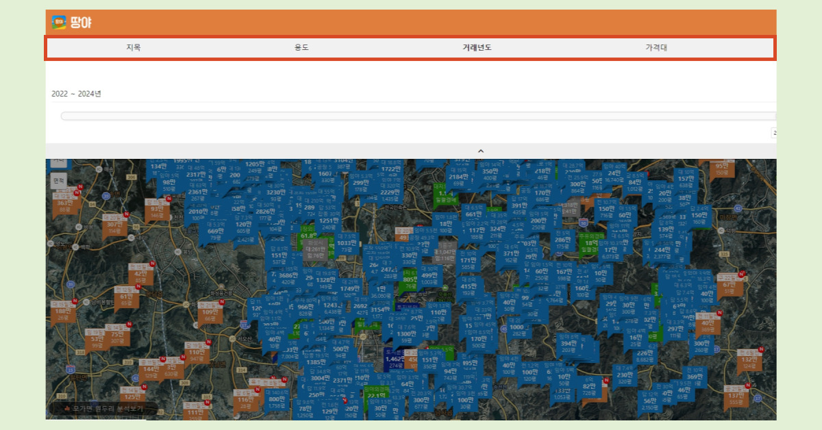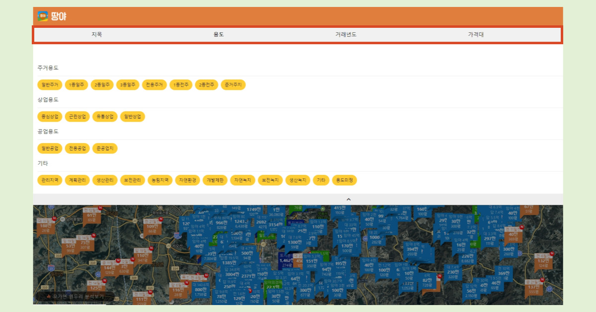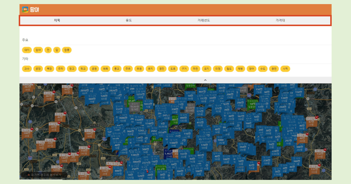 - 입력한 주소 주변의 거래된 토지 실거래가가 표시됩니다.