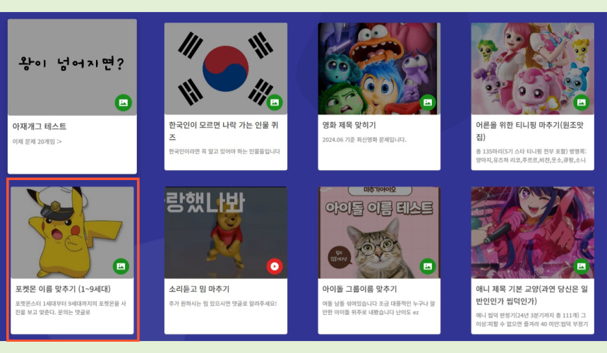 플랫폼 접속: 웹페이지에 접속하면 여러 퀴즈 주제를 섬네일 형식으로 확인할 수 있습니다.