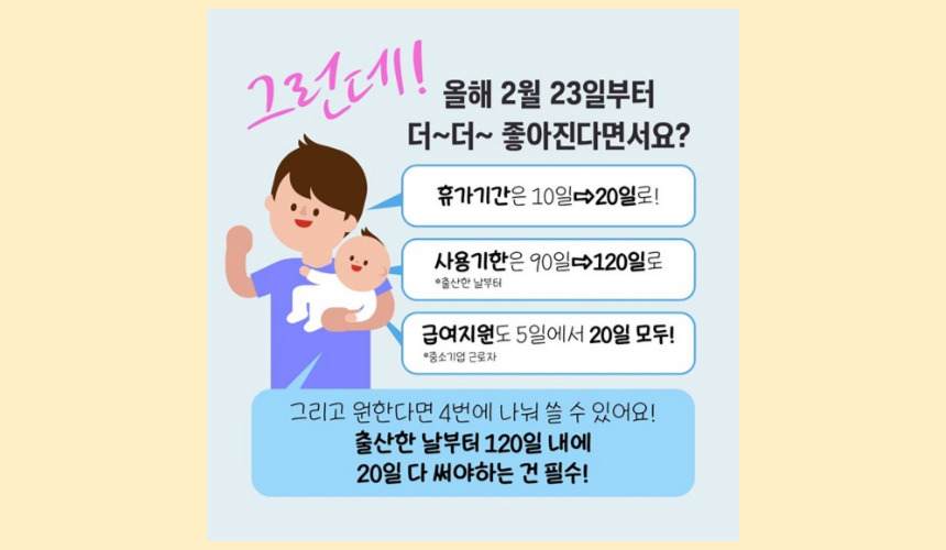 기존 10일이었던 배우자 출산휴가가 20일로 늘어납니다. 두 배로 늘어난 배우자 출산휴가는 출산 후 가족과 함께하는 시간을 더 많이 확보할 수 있도록 돕습니다.