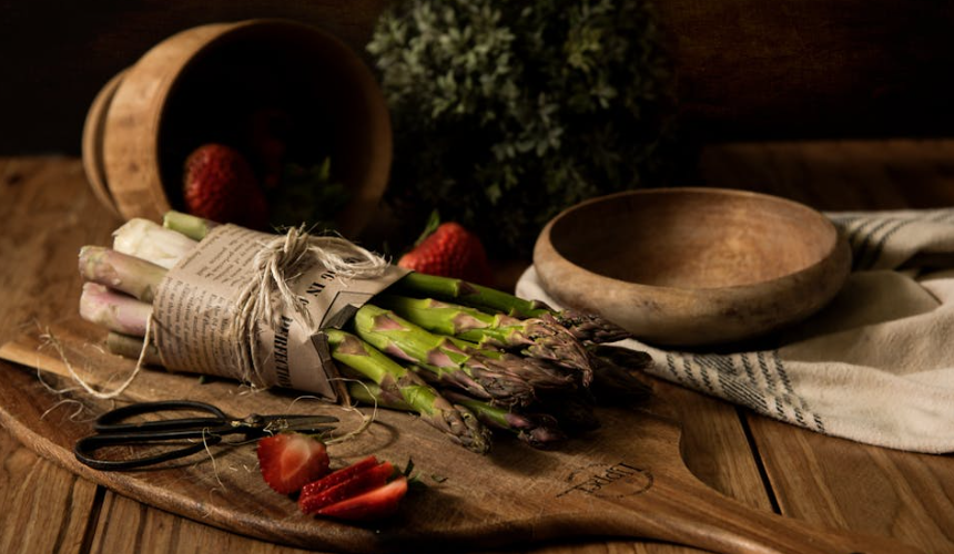 아스파라거스를 고를 때는 색이 선명하고 싱싱하며 아래까지 탄력이 있는 것을 선택합니다. 꽃이 보이는 것은 피해야 하며, 손가락으로 밑동을 눌렀을 때 즙이 조금 나오는 것이 신선한 상태입니다.
