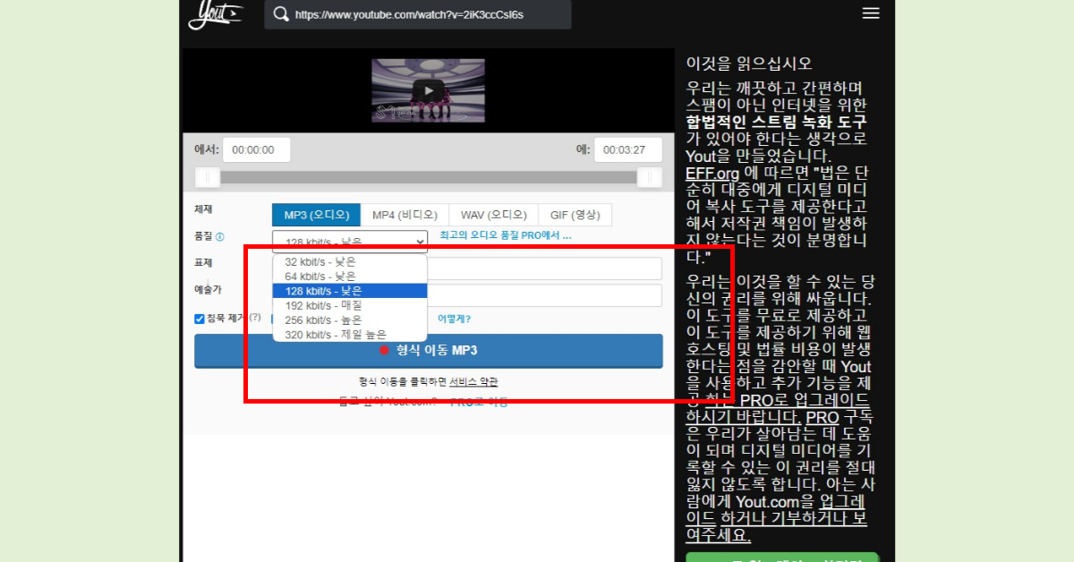 - 형식 및 품질 선택: 위에서 설명 드린 것처럼 유튜브 음원추출을 진행 하시면 됩니다. 원하는 형식과 품질을 선택하여 음원을 다운로드합니다. 변환 사이트에서는 다양한 형식과 품질을 제공하며, 사용자는 자신의 필요에 맞게 선택할 수 있습니다.