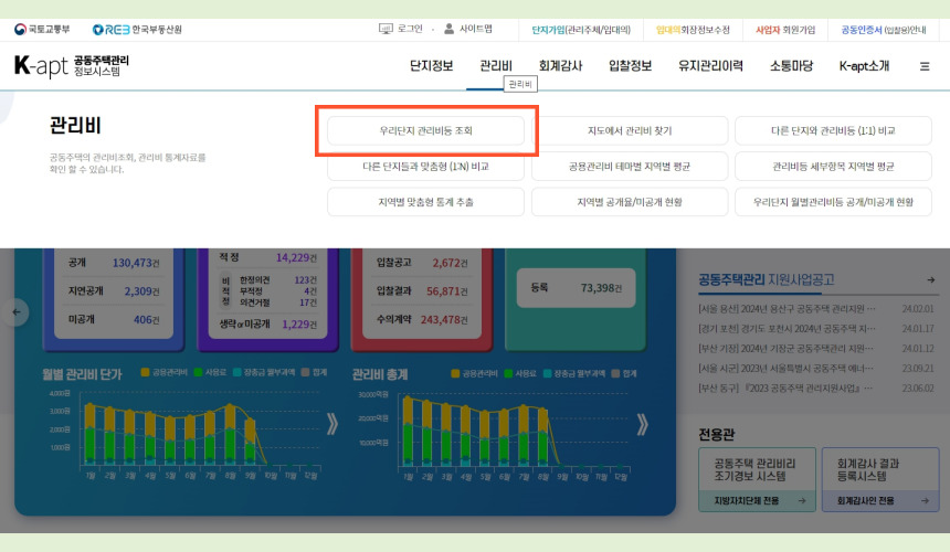 - 관리비 메뉴 선택: 상단 메뉴에서 '관리비'를 클릭한 후, '우리 단지 관리비 등 조회'를 선택합니다.