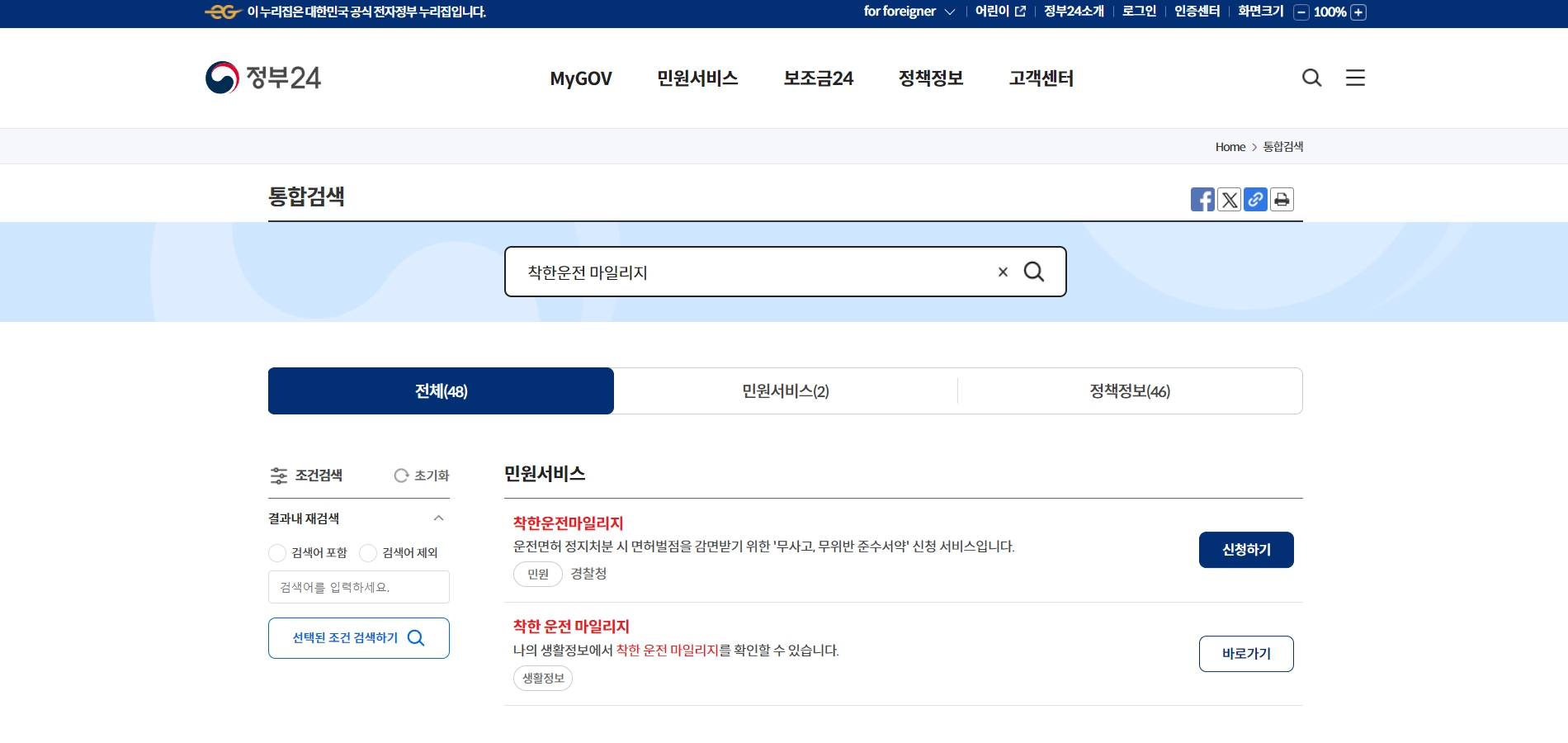 검색 후 가장 윗 화면에 나오는 민원서비스 중 '착한운전 마일리지'신청하기를 클릭합니다.