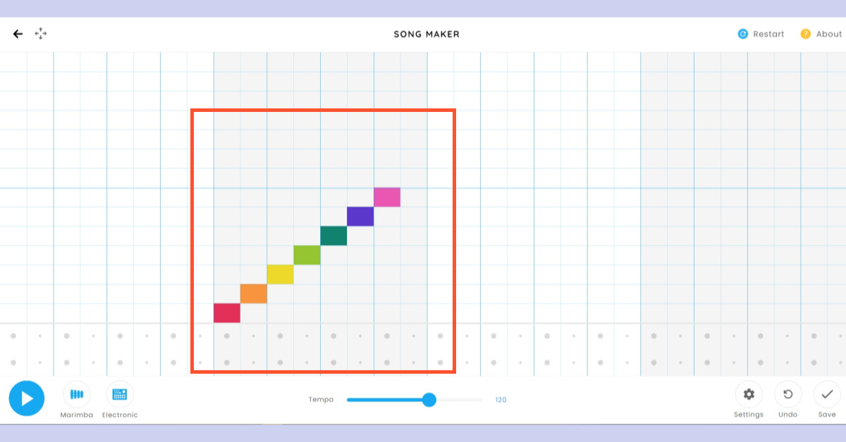 음표를 추가하려면 그리드의 원하는 위치를 클릭합니다. 각 칸을 클릭하면 해당 위치에 음표가 생성되며, 위치와 색상은 각각 다른 음정을 나타냅니다. 음정을 변경하려면 클릭 위치를 위아래로 이동하면 됩니다.