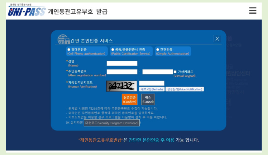 • 공인인증서, 휴대폰 인증, 또는 간편 인증 서비스를 통해 본인 확인 절차를 진행합니다. 인증이 완료되면 개인 통관번호가 발급됩니다.