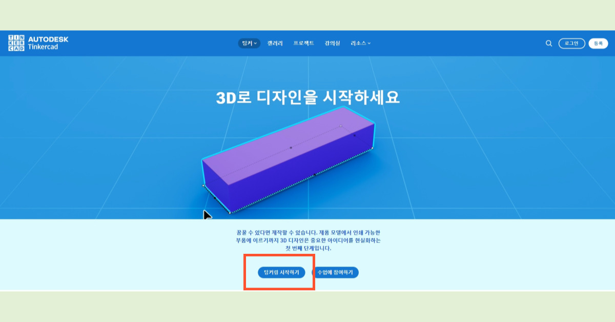 홈페이지에 접속한 후 '팅커링 시작' 버튼을 클릭합니다. 팅커캐드는 클라우드 기반의 프로그램으로, 별도의 다운로드가 필요하지 않습니다. 웹 브라우저에서 바로 사용이 가능합니다. 따라서 팅커캐드를 사용하기 위해서는 인터넷 연결이 필요합니다.