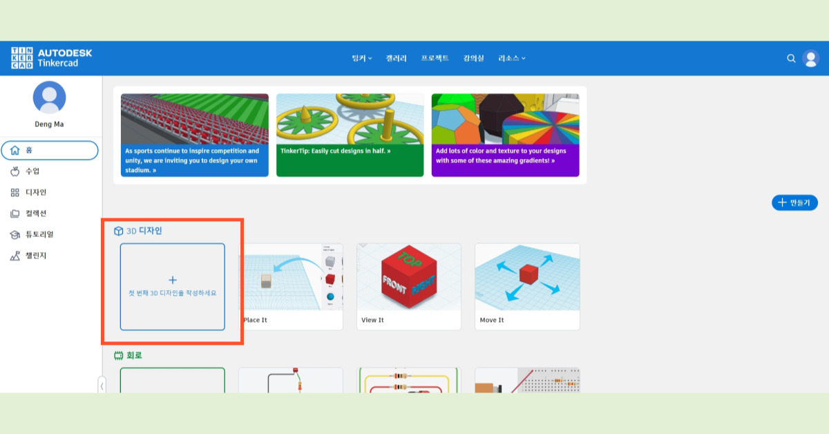 개인 사용자로 로그인한 후 '새 디자인 작성' 버튼을 눌러 3D 설계를 시작할 수 있습니다. 이 버튼을 클릭하면 3D 물건을 설계할 수 있는 화면이 나타납니다. 팅커캐드의 조작법은 매우 직관적이어서 몇 번만 시도해 보면 쉽게 익힐 수 있습니다. 이름표, 컵 등 다양한 3D 모델링을 시도해 볼 수 있습니다.