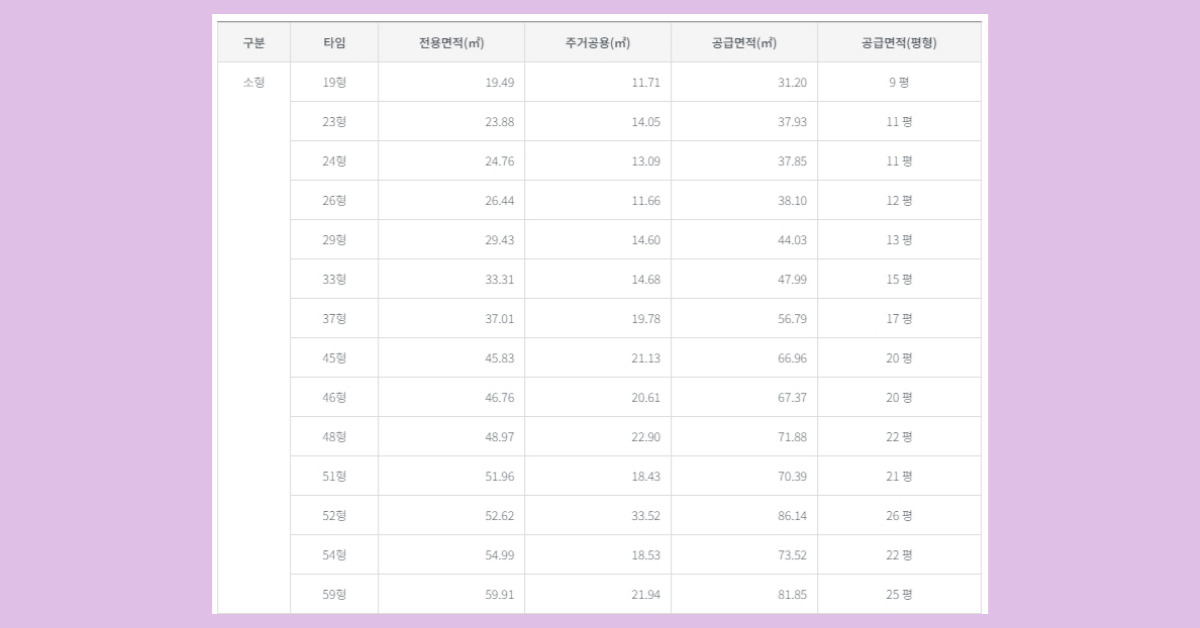 - 공급면적: 전용면적에 더해 공용 공간을 포함한 면적입니다. 공용 공간에는 엘리베이터, 계단, 복도 등이 포함됩니다. 따라서 공급면적은 항상 전용면적보다 크게 나옵니다.