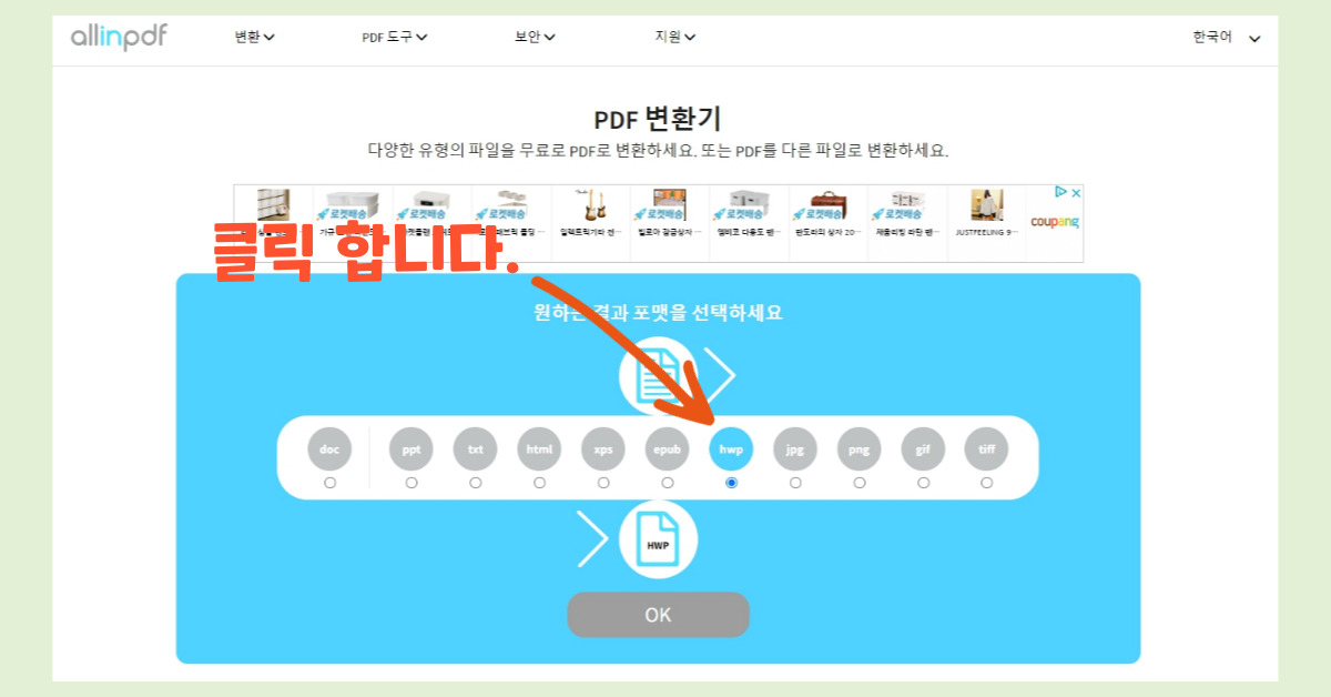 상단 메뉴에서 '변환' 버튼을 클릭한 후 HWP로 변환을 선택합니다.