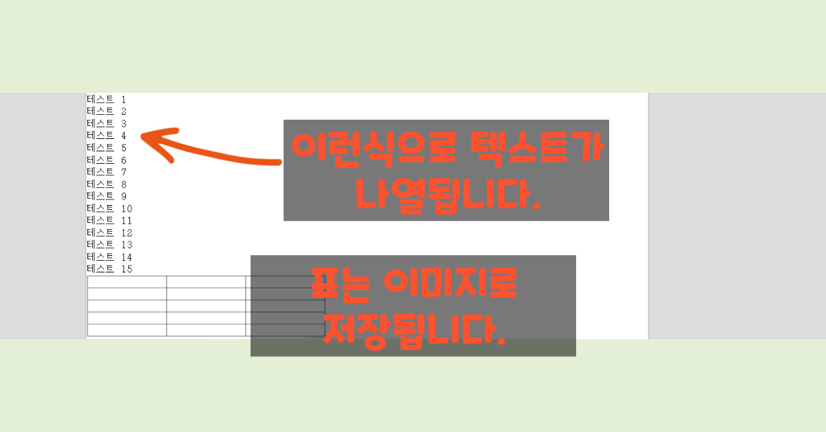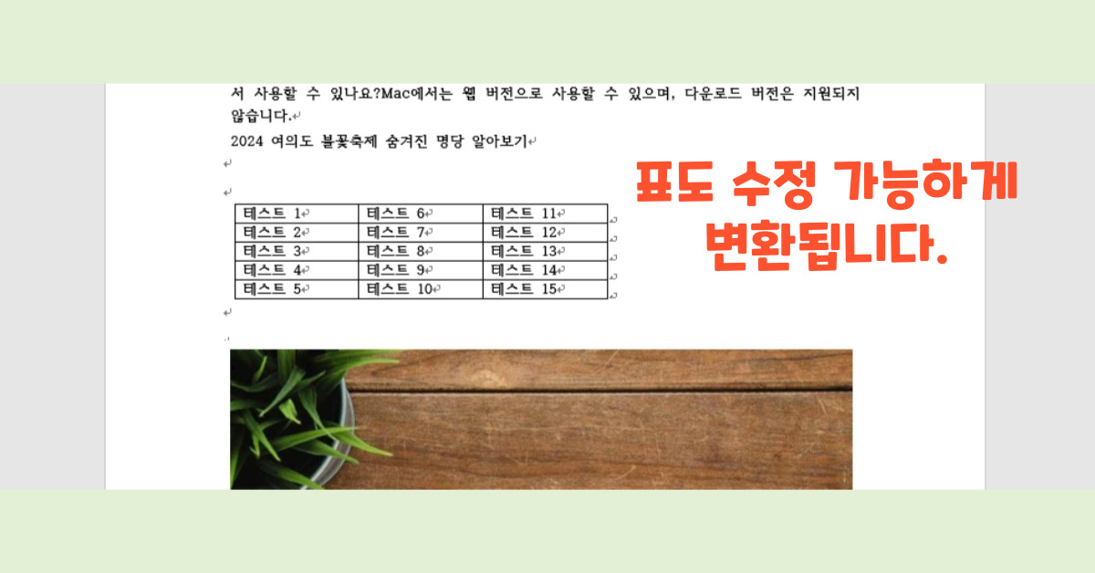 표의 경우, 표 안에 있는 텍스트가 줄글로 변경되며, 표는 이미지화되어 크기 등 수정이 불가능합니다.