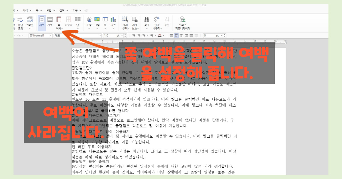 HWP 파일의 여백 설정이 풀린 상태로 변환되어 여백 설정을 다시 해줘야 합니다.