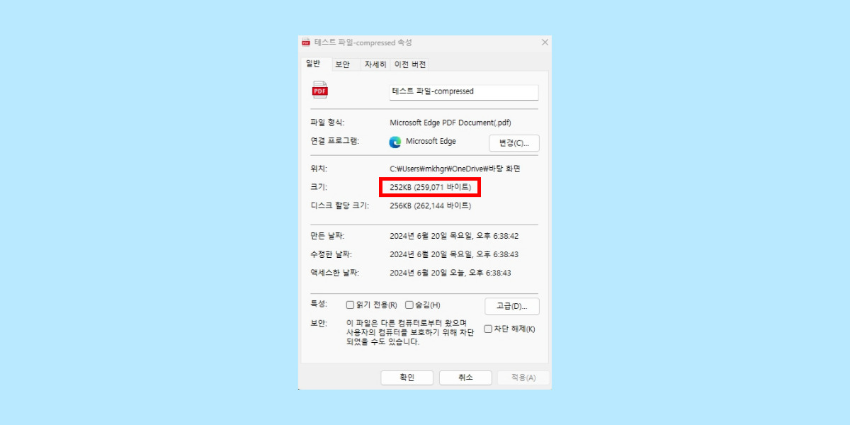 결과: PDF 용량 줄이기를 통해 압축 전 파일 용량 934KB을 압축 후 240KB로 줄였습니다.