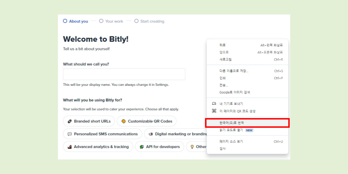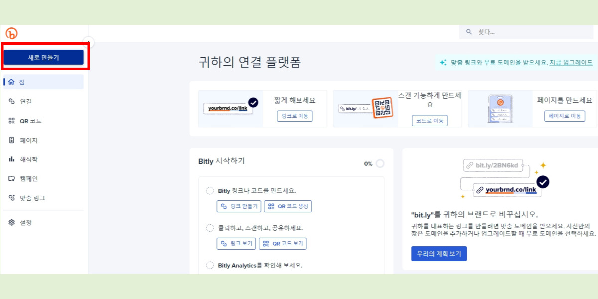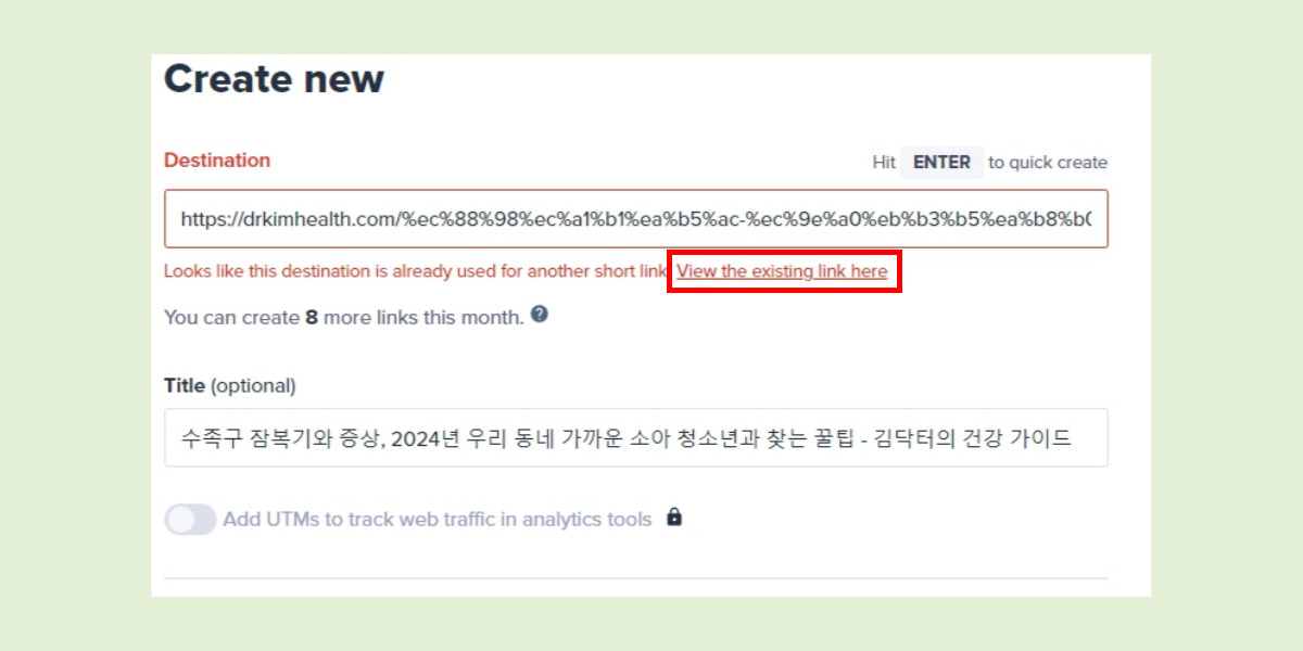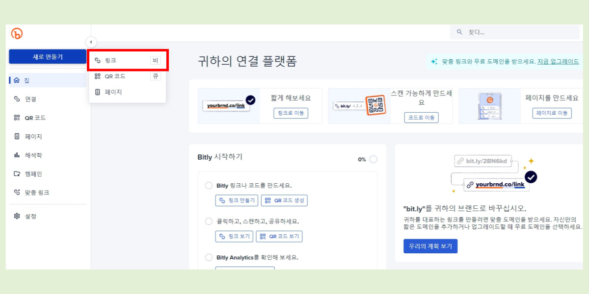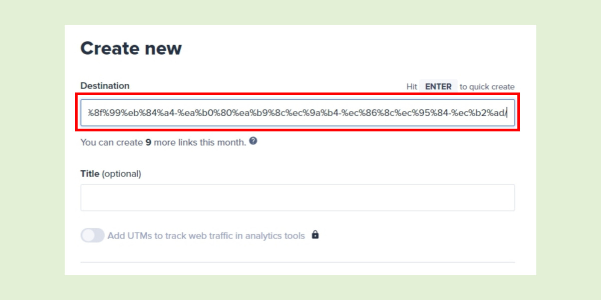 로그인 후 화면 좌측의 "Create new"를 클릭하고, "Link" 버튼을 클릭합니다. 여기서 목적지 URL을 입력합니다. 긴 URL을 입력하면, 제목은 자동으로 생성됩니다. 다음으로 "Enter"를 입력하면 단축 URL이 만들어집니다.