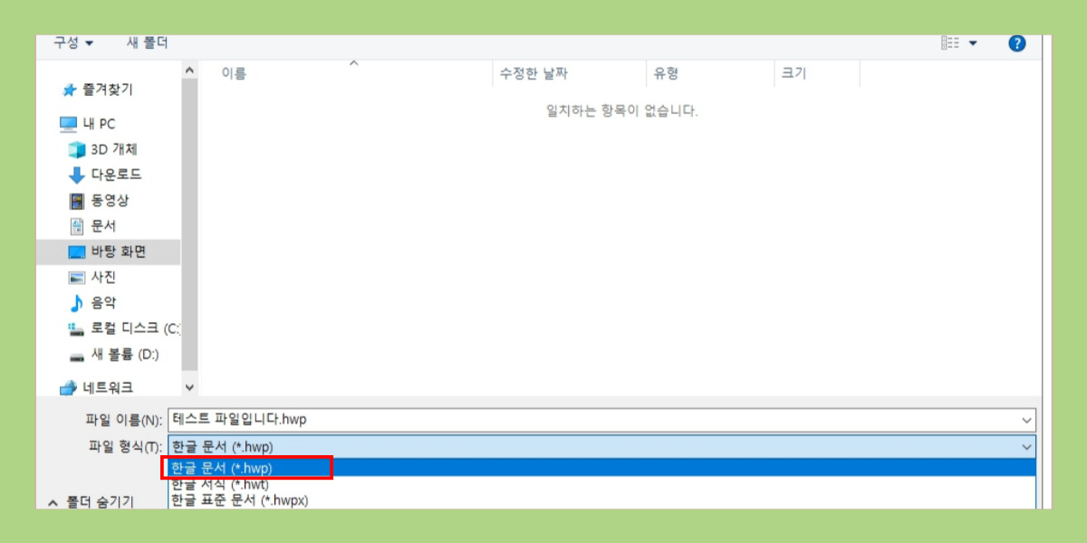 파일 형식 선택하기: '한글 문서 (*.hwp)'를 선택한 후 원하는 저장 장소에 파일을 저장합니다.
