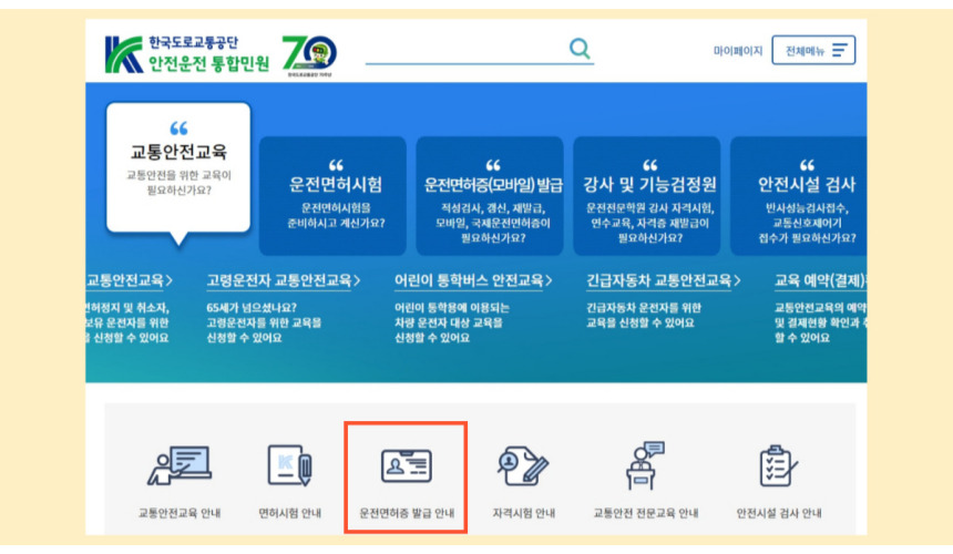 - 도로교통공단 안전운전 통합 민원 홈페이지에 접속합니다.