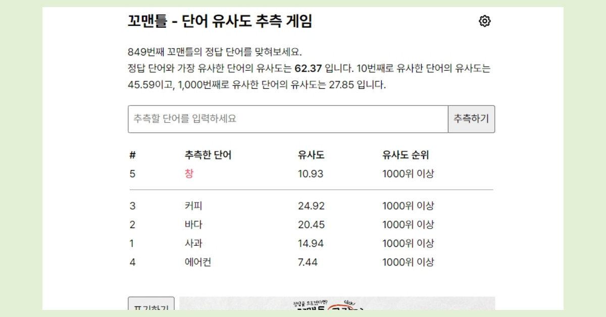 오늘은 매일 하나의 단어를 맞추는 게임인 '꼬맨틀'에 대해 알아보겠습니다. 이 게임은 정답 단어를 추측하고, 추측한 단어가 정답과 얼마나 유사한지를 점수로 알려주는 게임입니다. 이 점수를 기반으로 단어를 계속 추측해 나가며 최종 정답에 도달하는 것이 게임의 목표입니다. 꼬맨틀은 특히 두뇌를 자극하는 퍼즐 게임을 좋아하는 이들에게 큰 인기를 끌고 있습니다.