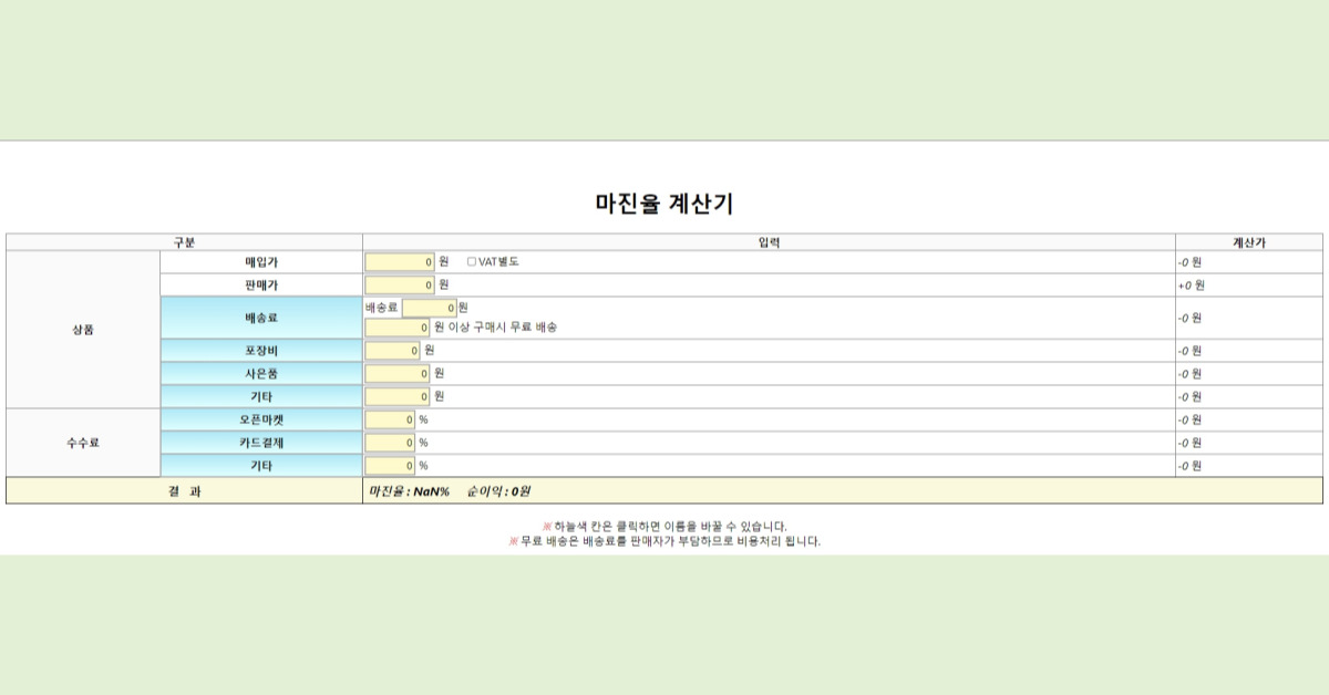 먼저 아래 링크로 이동하면 다양한 환경에 적용 가능한 마진율 계산기를 사용할 수 있습니다. 다만 아래 내용을 한번 확인 하신 후 사용 하시는 것을 권장 드립니다.