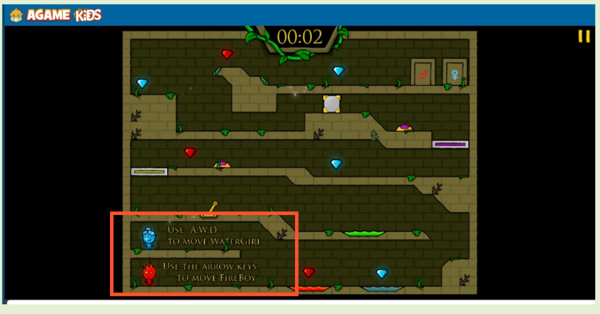 게임을 시작하면 주인공인 파이어 보이와 워터 걸이 화면 좌측 하단에 나타납니다. 하나의 키보드로 2인 플레이가 가능하며, 시작 화면에서 조작키를 확인할 수 있습니다. 물불게임의 목표는 각자의 출구 문으로 탈출하는 것입니다. 이를 위해 숨겨진 문을 찾고, 함정을 피하며, 다양한 미션을 수행해야 합니다.