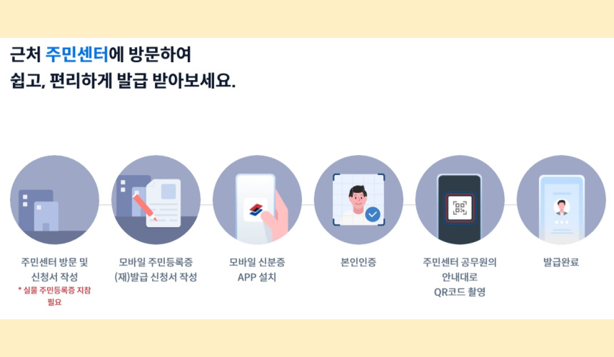 IC칩이 없는 주민등록증을 사용하는 경우에는 직접 주민센터를 방문해야 합니다. 그곳에서 발급용 QR코드를 받아 모바일 신분증 등록을 진행하게 됩니다. 이 방식은 스마트폰을 바꿀 때마다 다시 방문해야 한다는 번거로움이 있습니다.