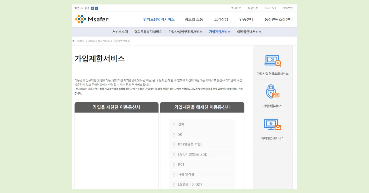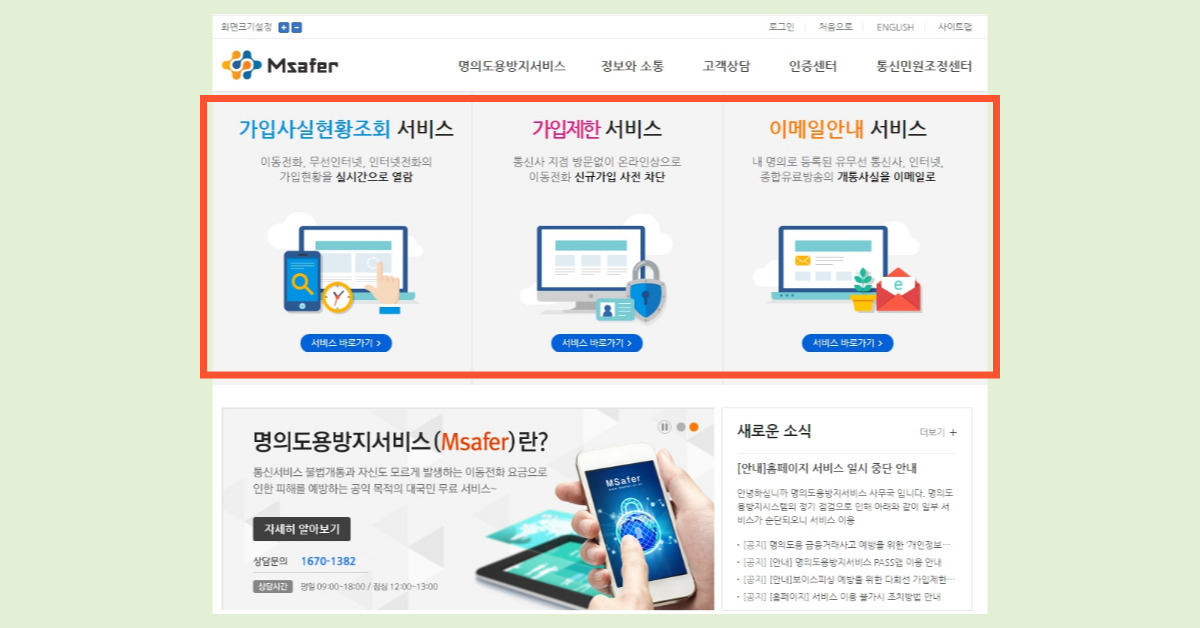 아래 링크를 클릭하시면 엠세이퍼 명의도용 방지 서비스로 이동됩니다.