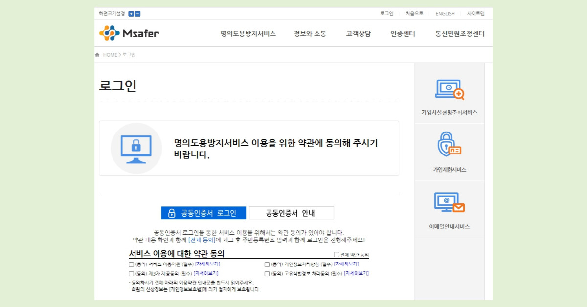 이 서비스는 매우 간단합니다. 엠세이퍼 명의도용 방지 서비스의 홈페이지에 접속한 후, 공동 인증서나 금융 인증서를 사용해 로그인하면, 어떤 통신사가 내 명의로 가입되어 있는지 손쉽게 확인할 수 있습니다. 이 서비스를 통해 불필요한 가입 내역을 사전에 파악하고, 명의도용이 발생했을 가능성을 점검할 수 있습니다.