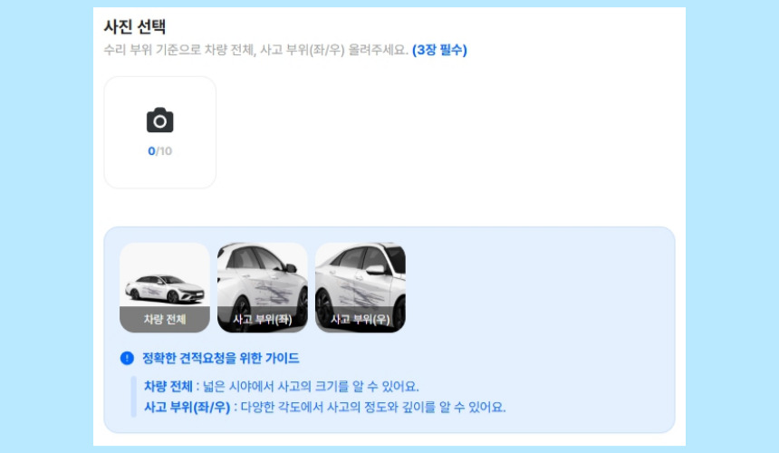 차량의 손상된 부위를 여러 각도에서 선명하게 촬영한 후 업로드합니다. 사진을 찍을 때는 빛 반사가 없도록 하고, 손상 부위가 명확히 보이도록 찍는 것이 중요합니다. 추가적으로 손상의 정도를 설명하는 글을 함께 작성하면 보다 정확한 견적을 받을 수 있습니다.
