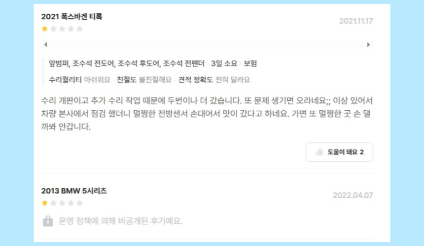 모든 정비소가 동일한 기술력을 가진 것은 아닙니다. 일부 업체는 특정 부위 수리에 특화되어 있을 수 있으므로, 내 차량 손상 부위에 맞는 전문 업체를 선택하는 것이 좋습니다. 내 차량과 동일한 차종을 수리 한적이 있는지 확인해 보는 것도 좋을 것 같습니다.