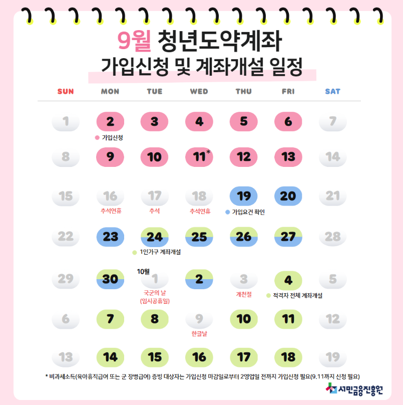 계좌 개설 가능 기간은 1인 가구 청년의 경우 9월 24일 부터 10월 18일까지이며, 2인 이상 가구 청년은 10월 4일부터 10월 18일 까지 입니다. 이 기간 안에 계좌를 개설하면 청년도약계좌 기여금 확대 혜택을 받을 수 있습니다.