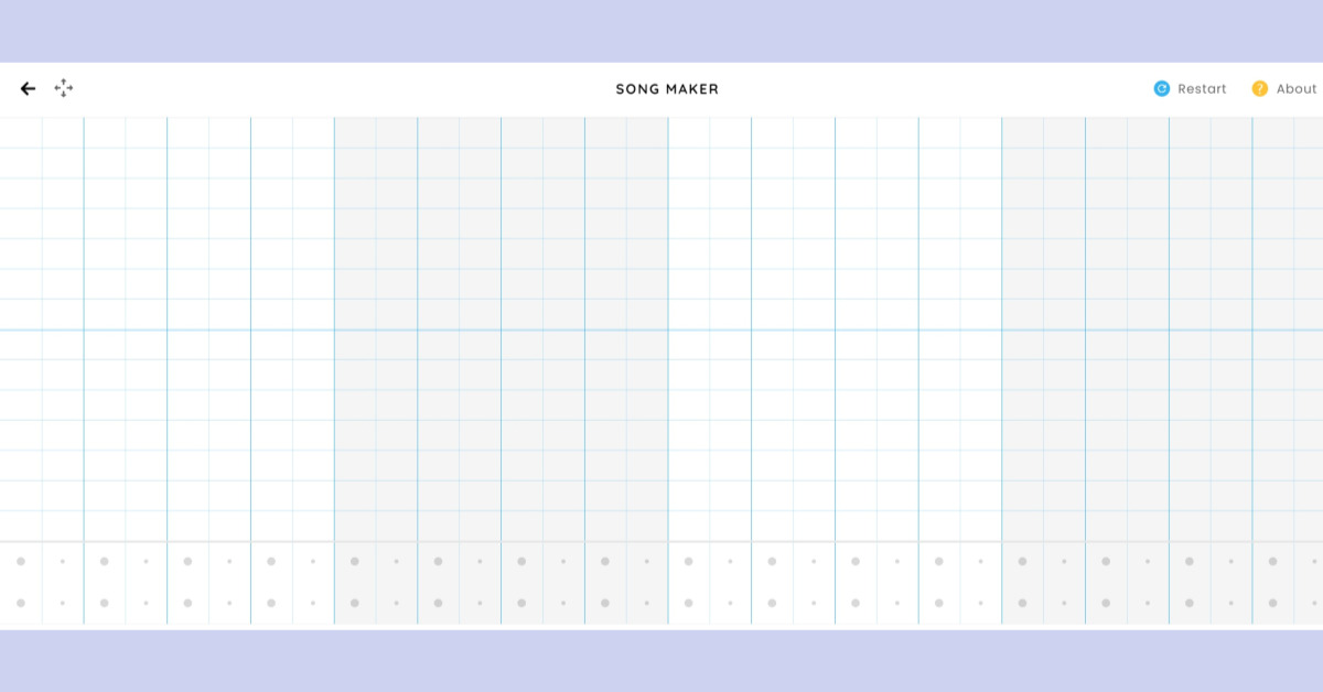 먼저 위에 안내된 링크로 접속합니다. 웹사이트에 접속하면 여러 가지 음악 도구가 나열되어 있습니다. 그중 송메이커를 클릭합니다. 크롬 뮤직랩 송메이커를 열면, 빈 그리드 화면이 나타납니다. 이 그리드는 음표를 배치할 수 있는 공간으로, 각 칸은 시간과 음정을 나타냅니다. 세로축은 음정을, 가로축은 시간을 나타냅니다.