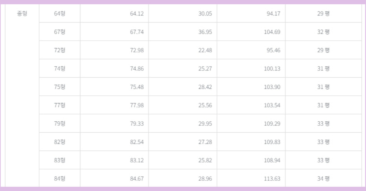 - 공급면적: 전용면적에 더해 공용 공간을 포함한 면적입니다. 공용 공간에는 엘리베이터, 계단, 복도 등이 포함됩니다. 따라서 공급면적은 항상 전용면적보다 크게 나옵니다.