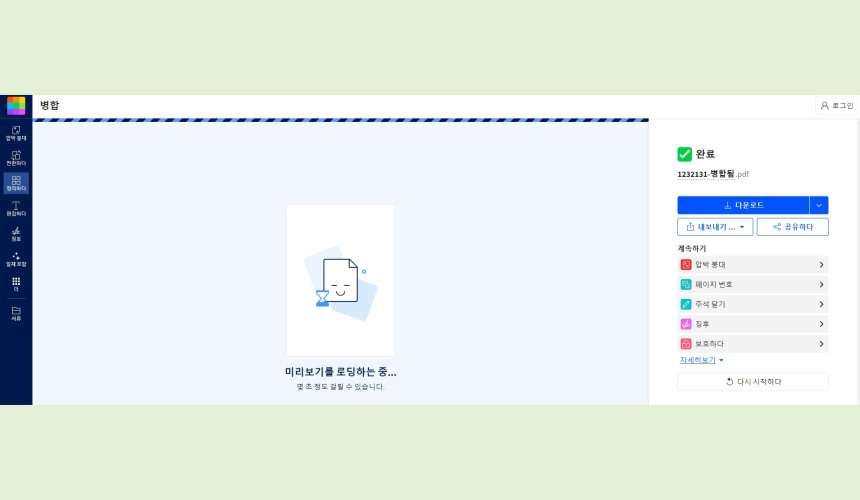 - 합치기가 완료되면 병합된 PDF를 다운로드하여 원하는 폴더에 저장하시면 됩니다.