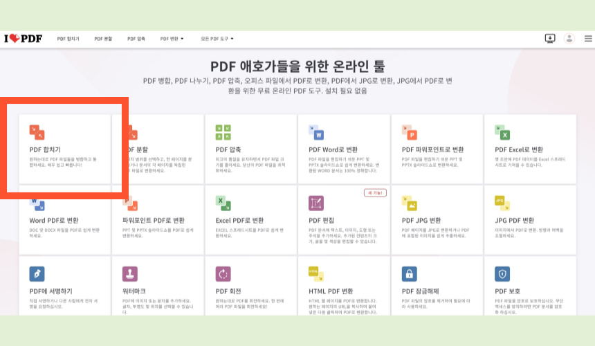 - 사이트에 접속하여 "PDF파일 합치기" 기능을 선택합니다.