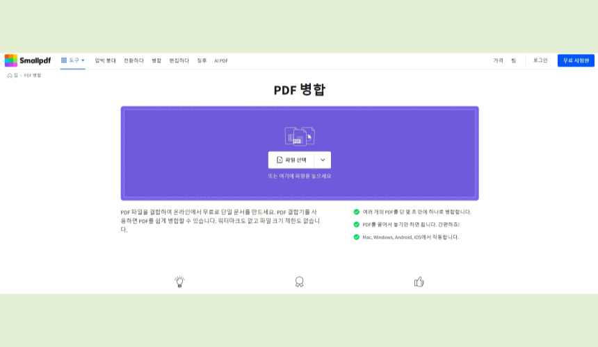 'Small PDF'는 PDF파일 합치기 전 간단한 편집 기능도 제공하여 유용하게 사용할 수 있습니다. 다만, 다시 파일을 업로드해야 하는 번거로움이 있을 수 있습니다. 이 외에도 PDF 압축, 변환, 암호화 등의 다양한 기능을 제공하여 여러 가지 PDF 작업을 한 곳에서 처리할 수 있습니다.