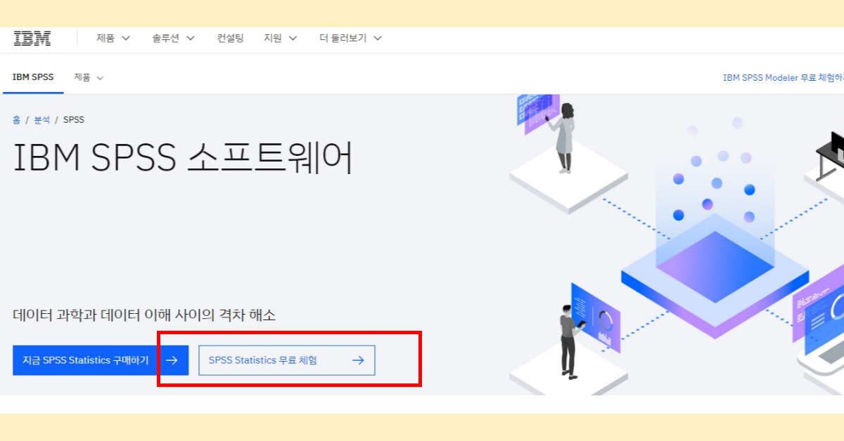 링크에 접속한 후 'SPSS Statistics' 버튼을 클릭합니다. 체험판을 사용하기 위해서는 먼저 IBM 계정을 생성해야 합니다.
