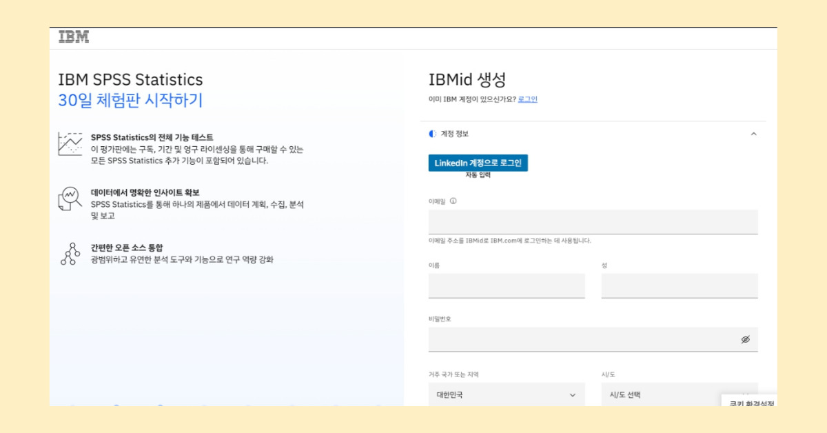 설치 과정은 어렵지 않습니다. 안내에 따라 차례대로 진행하시면 됩니다. 설치가 완료되면 IBM 계정으로 로그인한 후, 이메일 인증을 한 번 더 진행하면 됩니다. 이후 인증이 완료되면 SPSS 체험판을 사용할 수 있습니다.