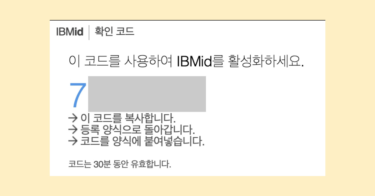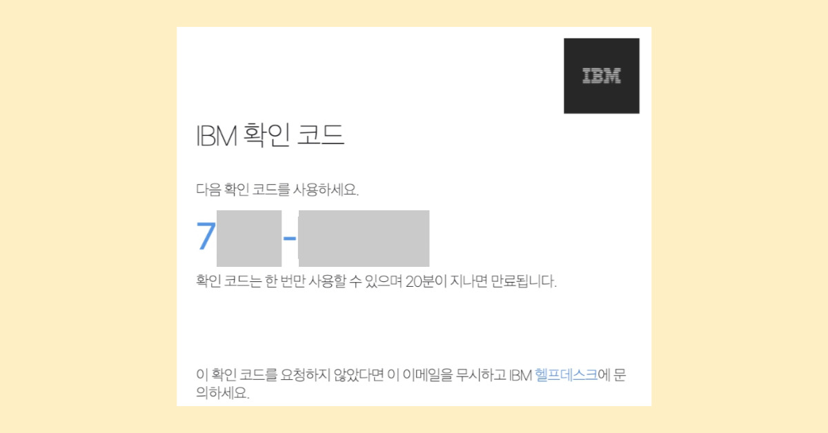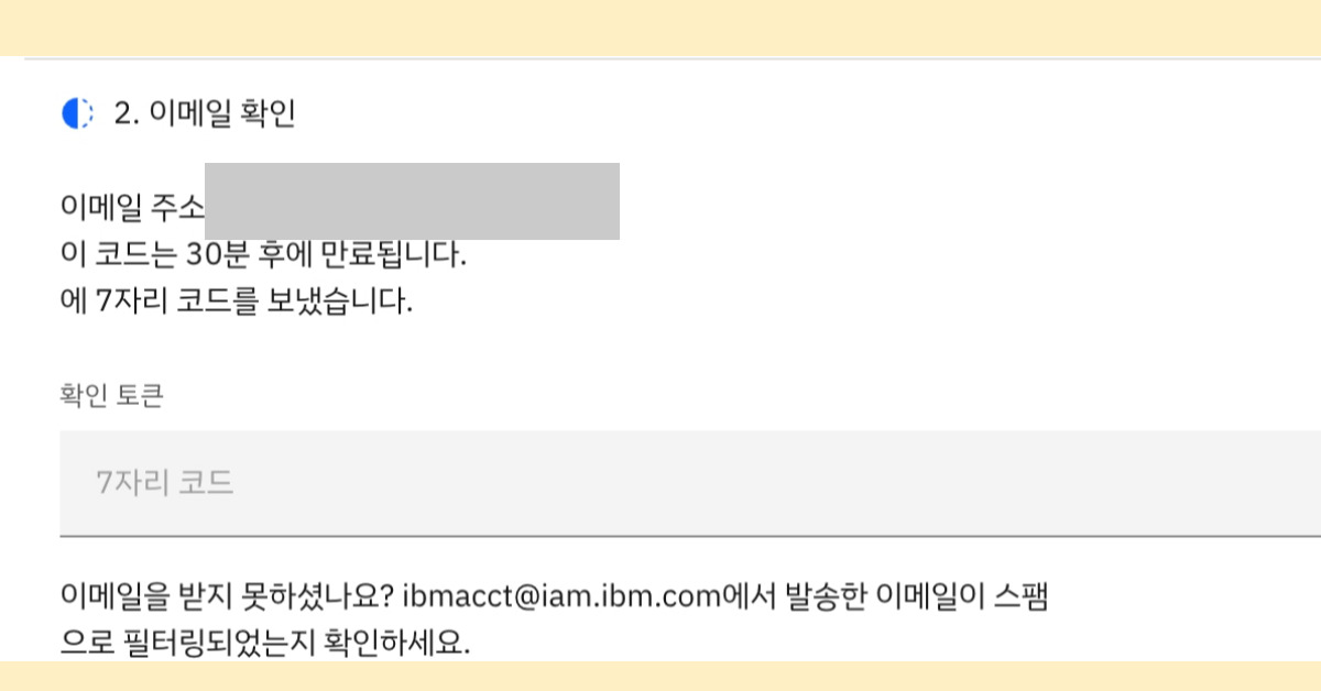 이메일 인증을 완료한 후 보안을 위해 동일한 이메일 주소로 전송된 IBM 확인 코드를 한 번 더 입력합니다. 이 과정이 끝나면 회원가입이 완료됩니다.