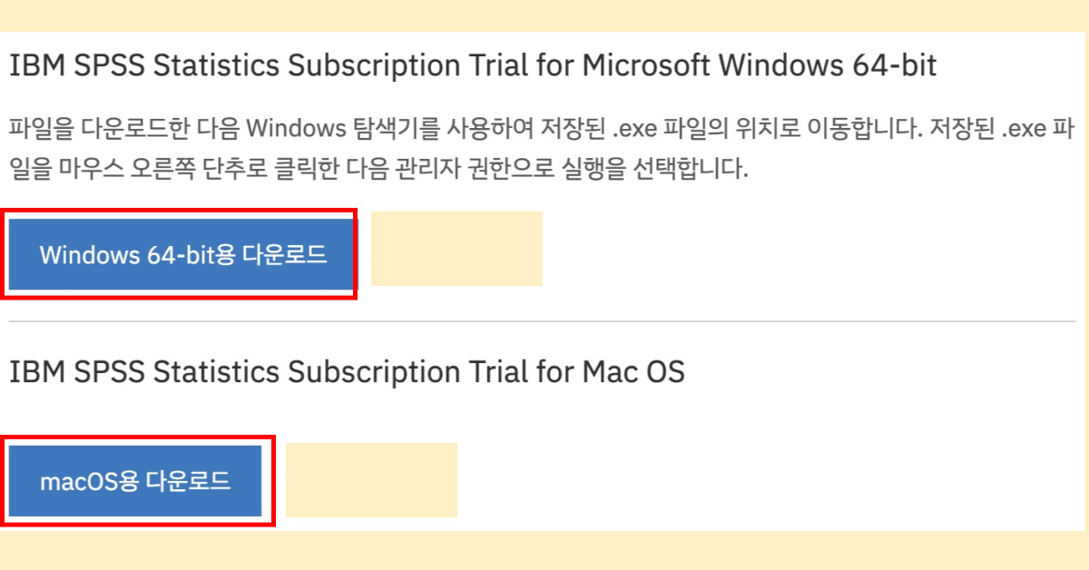 다운로드 페이지에 접속하면 윈도우 64비트 또는 Mac OS 버전의 SPSS 체험판을 선택할 수 있습니다. 반드시 자신의 운영체제에 맞는 버전을 다운로드해야 합니다.